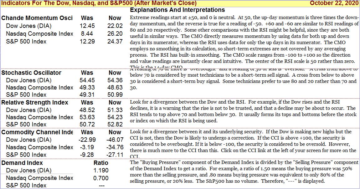 Today, the Dow reached its low at about 10:45, and then began to climb after that., reaching its high at about 14:20. It then moved sideways until the close with a small gain. Investors are waiting to see if a relief package is agreed to before the weekend (Pelosi’s deadline for getting a deal before the election). In our view, there is nothing special about the exact timing of the agreement. If negotiators are as close to an agreement as they say, an agreement is going to be reached very soon. The market will respond positively to that. Note that volume was low again, but greater than it was yesterday. Potential investors are waiting for an agreement in Washington. Note, again, the green line labeled “Z.” Support there is still active. Note that the real body of the candlestick (the range between the open and high) is above that line, though the Dow temporarily dropped to the 50-day moving average and rebounded from there. If there is no agreement on Friday, there is a good chance that the 50-day moving average will be tested again. If there is an agreement, there will b e a rally. These scenarios are news-dependent, and technical analysis cannot predict news events. However, in either event, the fact remains that the Dow is near a region consisting of several levels of support, making it likely that buying demand will prevent any selling from getting out of control. At this point, the probabilities favor support at the 50-day moving average arresting the decline. To get a sense of how the market is likely to close on Friday, monitor the benchmarks during the first hour relative to the Key Intraday Levels posted below. Also, look for early indications of the probable open suggested by pre-market data that we post in our “Early Notes.” Check the “Earnings Due” page for a list of companies about to report earnings. Maintain stop losses at levels you can tolerate if they are triggered. ~ Our site is focused on “setups,” chart configurations that are most often seen before a price surge. Be sure to wait for the “trigger event.” A “trigger event” is your buy signal, assuming there is not overhead resistance or other contrary indications. For more on setups, go the Q&A page and read item 13. Then use the link at the end of that explanation.