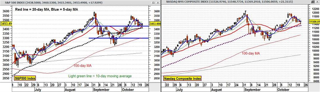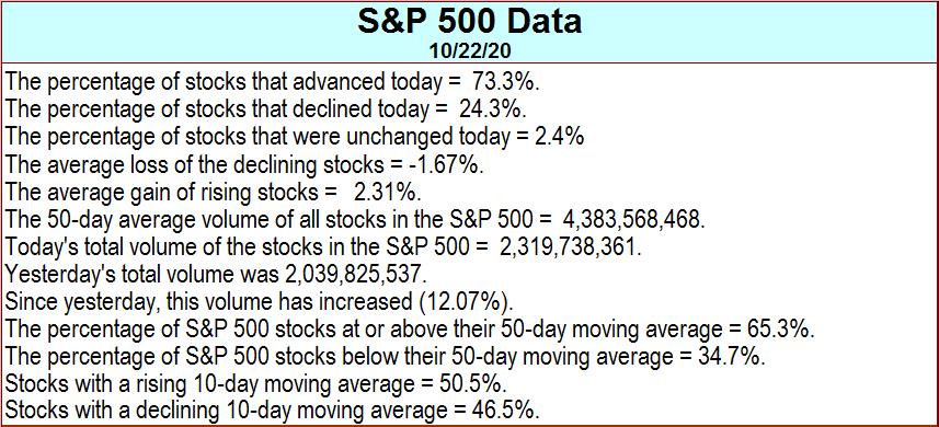 Stock benchmarks closed higher Thursday as talks in Washington in regard to a fresh coronavirus fiscal relief package continued to inch along, but House Speaker Nancy Pelosi said Democrats and the Trump administration were on the verge of an agreement. Investors are concerned over whether the economic recovery would lose momentum in the fourth quarter without another round of aid from Washington. “If we can resolve some of these things in the next few days, it’ll take a while to write the bill … We can do something great, and I’m still optimistic that we can do that,” Pelosi said. President Trump has been pushing for a large deal, but Senate Republicans have been resisting the idea of a $1.9 trillion-plus package as being too much. Some investors are not particularly concerned about whether a deal is made before or after the election. The bottom line is that an agreement is on the way. Investors are concerned about another wave of European and American coronavirus cases, while fretting over uncertainty about the outcome of the Nov. 3 elections (there is a final presidential debate on Thursday night). In addition, Investors are parsing results from a number of important companies. ~ The seven-day moving average of new cases in the U.S. was at 59,527 as of Tuesday, while the 14-day average was at 55,282, according to an analysis of data compiled by Johns Hopkins. When the seven-day average is greater than the 14-day average, it indicates cases increasing. ~ According to the Labor Department, first-time applications for weekly jobless benefits fell to a March low of 787,000 last week. Economists surveyed had, on average, anticipated 860,000 initial claims. ~ U.S. existing-home sales increased for the fourth consecutive month in September, with the U.S. housing market helped by low interest rates. The National Association of Realtors reported that total existing-home sales rose 9.4% from August to a seasonally-adjusted, annual rate of 6.54 million. ~ The Conference Board reported that leading economic indicators rose 0.7% last month, after increases of 2% in July and 1.4% in August.